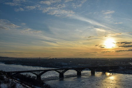 Novosibirsk, Siberia, Russia-18.12.2020: Winter evening on the Ob. Bridges cross the ice-covered river, Leninsky industrial district in the distance
