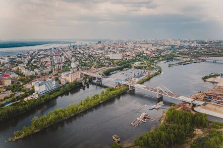 The big city is the capital of Siberia on the banks of the Ob River under a cloudy sky. Novosibirsk, Russia, 2020