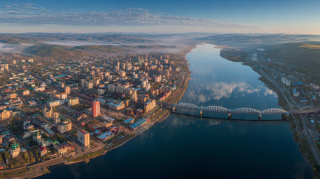Stunning aerial view showcasing a vibrant cityscape alongside a serene river at sunrise, reflecting nature and urban life in tranquil harmony.