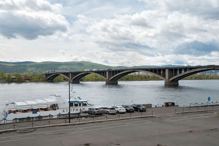 A tourist ship stands at the pier with parked cars near the Communal Bridge (1961) on the left bank. Krasnoyarsk. Russia.
