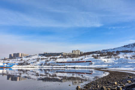 MURMANSK, RUSSIA - FEBRUARY 21, 2019: Evening panorama of the winter modern city