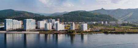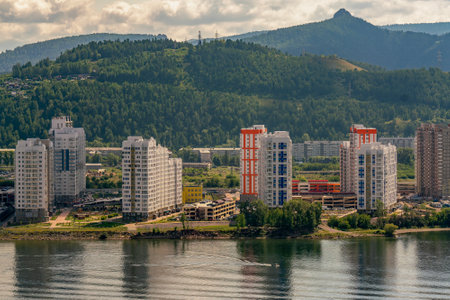 Summer landscape of Krasnoyarsk city. Modern apartment buildings by the Yenisey river