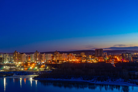 Evening panorama of Krasnoyarsk. Nikolaevsky 4th bridge and railway bridge over the Yenisei River at dawn. A Stunning Cityscape at Dusk Featuring Beautiful Twinkling Lights and a Majestic Bridge