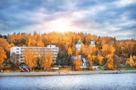 Pension Actor-Ples and Transfiguration Church in the city of Ples among red autumn trees. View from the water of the Volga.