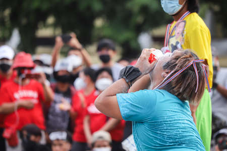 Bangkok, THAILAND - August 22, 2021: Thalufah group event the Politics symbolic action by simulating Thai politics in model Sports Day 'Tyrant vs. People' at Democracy Monument.