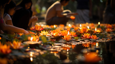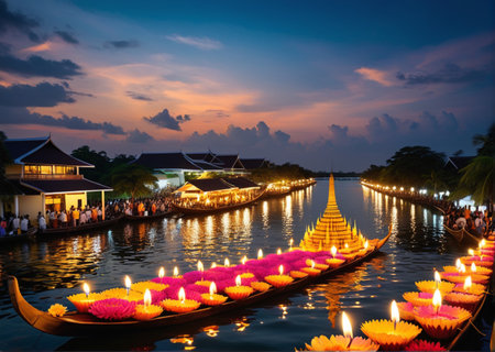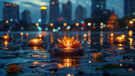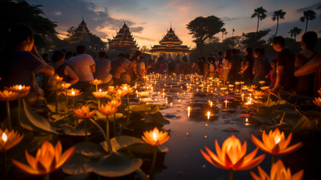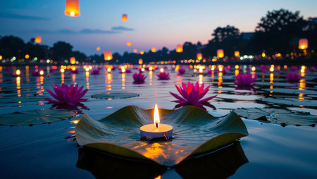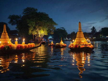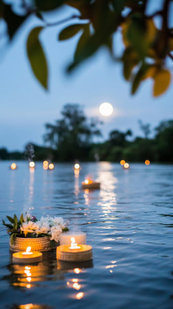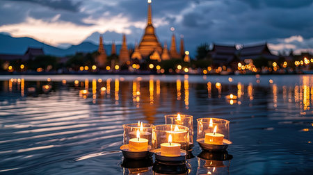 Experience the serene beauty of floating candles illuminating the water, with a stunning temple backdrop reflecting the essence of a vibrant festival night.