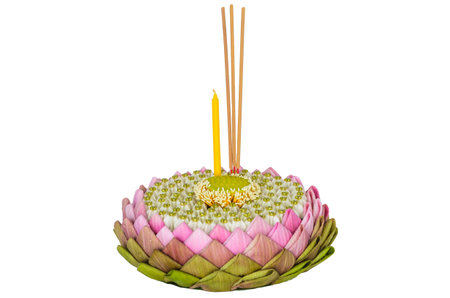 Pink lotus petal krathong that have 3 incense sticks and candle decorates with lotus pollen and crown flower for Thailand full moon or Loy Krathong festival isolated on white background.
