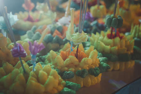 Krathongs made from snacks are yellow and green. Thailands traditional Loy Krathong festival