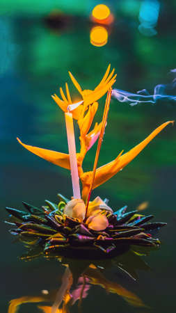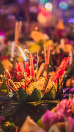 Loy Krathong festival, People buy flowers and candle to light and float on water to celebrate the Loy Krathong festival in Thailand VERTICAL FORMAT