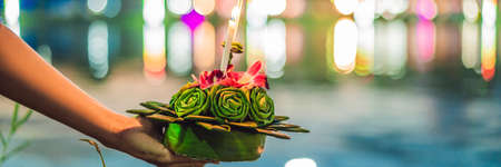 Loy Krathong festival, People buy flowers and candle to light and float on water to celebrate the Loy Krathong festival in Thailand BANNER, LONG FORMAT