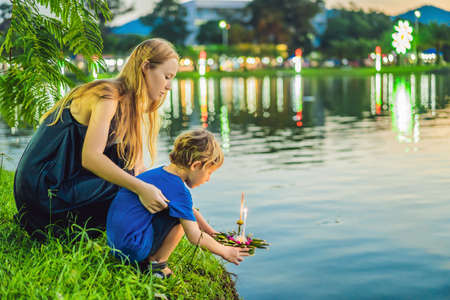 Mom and son tourists holds the Loy Krathong in her hands and is about to launch it into the water. Loy Krathong festival, People buy flowers and candle to light and float on water to celebrate the Loy Krathong festival in Thailand