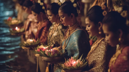 Loy krathong tradition that paid respects to the water spirits, Beautiful women dressed in Thai national costumes. Put the Krathong on the river, The word krathong refers to basket and loy means to float