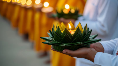 Magha Puja celebration with people holding traditional lotus-shaped leaf offerings with lit candles at a temple.