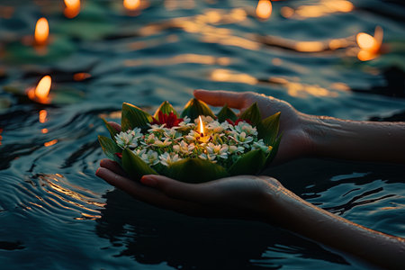 Hands gently placing a decorated krathong with flowers and a lit candle onto water during loy krathong festival