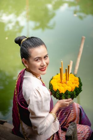 Beautiful woman ware Traditional Thai dresses hold floating basket or kratong, loy kratong festival in Thailand