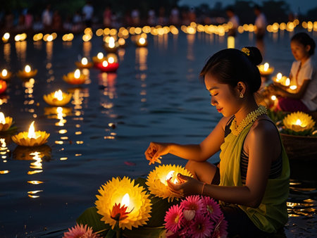 Young woman celebrates Loy Krathong, Runs on the water. Loy Krathong festival, People buy flowers and candle to light and float on water to celebrate the Loy Krathong festival in Thailand BANNER, LONG FORMAT