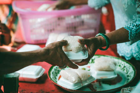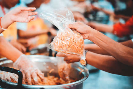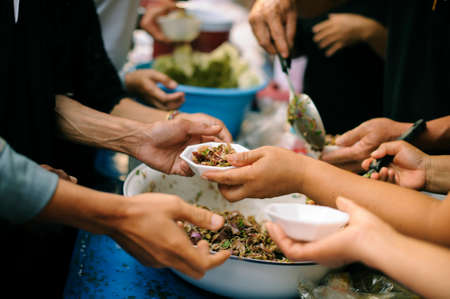 Volunteers provide food for beggars : Concepts Feeding and help : Concept of food sharing for the poor to alleviate hunger : Volunteers Share Food to the Poor