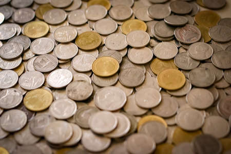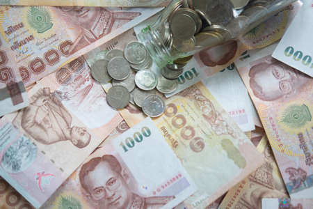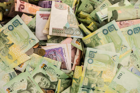 Thailand banknotes stacked by value.Rolls Thai banknotes.Thai currency money.Banknotes stacked on each other in different positions.On wood background.