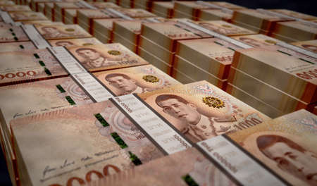 Thai Baht money pack 3d illustration. THB banknote bundle stacks. Concept of finance, cash, economy crisis, business success, recession, bank, tax and debt in Thailand.