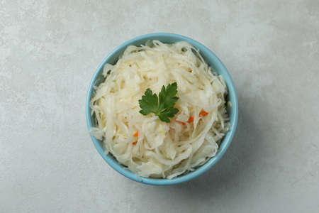 Homemade sauerkraut. Fermented food. Sauerkraut with carrots in a bowl on a concrete gray background. Top view, flat lay. Copy space.
