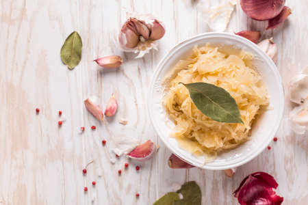 Organic sauerkraut (pickled cabbage) with onions, garlic, spices and bayleaf