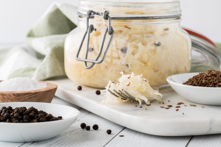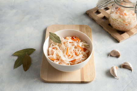 White ceramic bowl with homemade appetizer sauerkraut on a gray, concrete background. Glass jar and spices garlic and bay leaf. Close up composition.