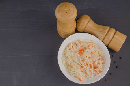 Traditional rustic winter food. Fermented cabbage sauerkraut with carrot. Ready to eat