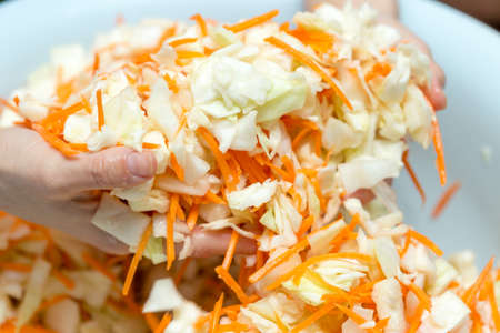 Adding carrots to cabbage, the process of cooking sauerkraut, finely chopped cabbage and carrots, healthy food for the intestines.