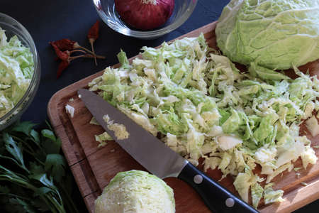Flat lay. Step by step. Shredding organic cabbage on a wood cutting board.