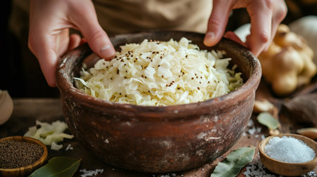 Chef serving fermented cabbage with mustard seeds, salt and bay leaves in a rustic bowl