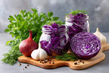 Glass jars with fermented purple cabbage, fresh dill, red onion, garlic and peppercorns on a wooden cutting board, ready for healthy preserving