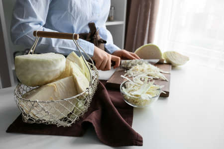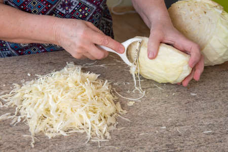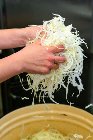 german sauerkraut (white fermented cabbage). Prepare sliced or cut vegetable for cooking cabbage salad or coleslaw. Homemade organic food concept.
