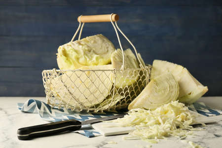 Sliced fresh cabbage on table. Juicy vegetables. Preparation of dishes from white cabbage. Still-life.