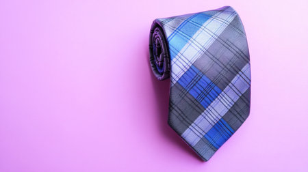 A stylish rolled tie featuring an eye-catching blue and gray plaid pattern against a vivid pink backdrop, perfect for fashion enthusiasts and accessories.