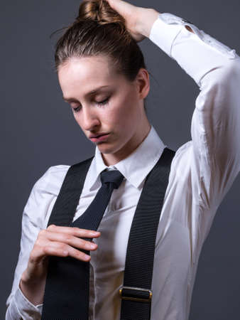 businessman getting ready to work from home, adjusting his tie, wearing light blue shirt, with blue tie and blue suit, monochrome