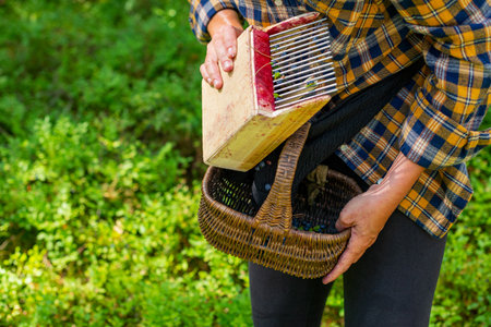 Woman with berry comb collecting forest berries into a handy wicker basket