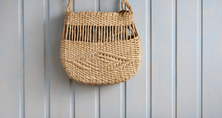 Stylish wicker bag hanging on a light blue wooden wall, evoking summer vibes and beach days