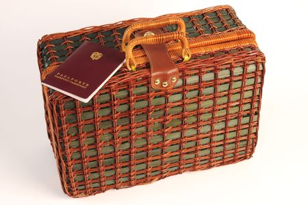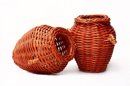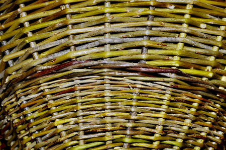 Wicker basket. Wooden basket. Rattan basket. Detail of a rattan basket. Wicker surface. Harvest and countryside background.