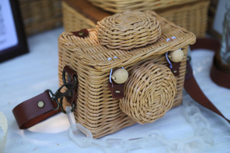 Fashionable stylish rattan bag outside. Tropical island of Bali, Indonesia. Rattan handbag.