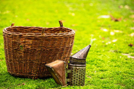 closeup of beekeeper tools, basket with chimney to catch bee swarm Apitherapy