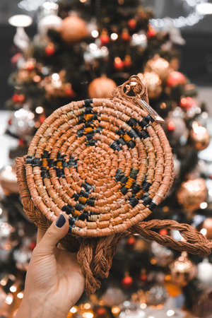 Closeup of female hand holding handmade wicker basket on Christmas tree background