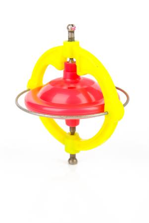 One bright spinning top on red background. Toy whirligig