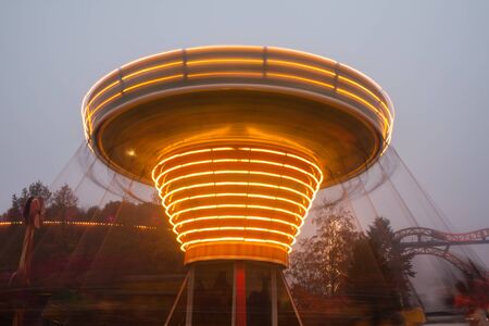 A blurry colorful chain carousel in motion at the amusement park, evening illumination. The effect of bokeh and long exposure