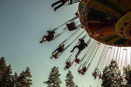 Kouvola, Finland - 18 May 2019: Ride Swing Carousel in motion in amusement park Tykkimaki and aircraft trail in sky.