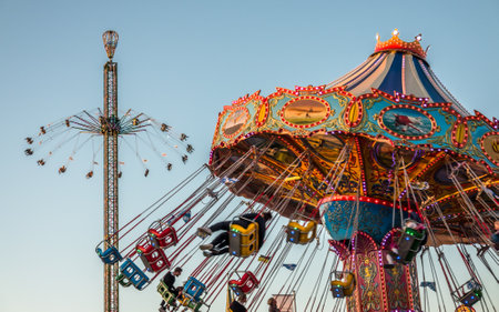 Spinning carousel at a fun fair at night in the UK