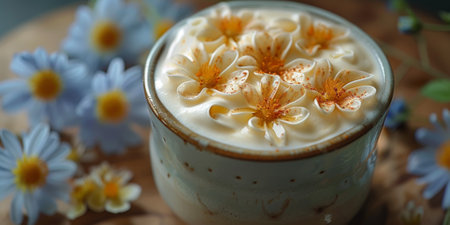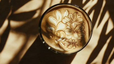 A stunning close-up of a floral latte art design atop a creamy coffee surface, showcasing artistic skill and inviting warmth in a cafe setting.