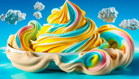 Bowl of ice cream with colorful swirls and clouds. Generative AI.