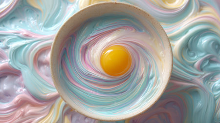 Dreamy visual composition, bowl of creamy pastel swirls surrounding golden yolk, macro detail focus, art-inspired photography