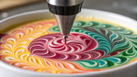 Food printing machine creating colorful patterns on liquid surface