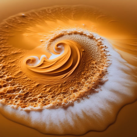 Coffee foam swirls on a yellow background. Macro.